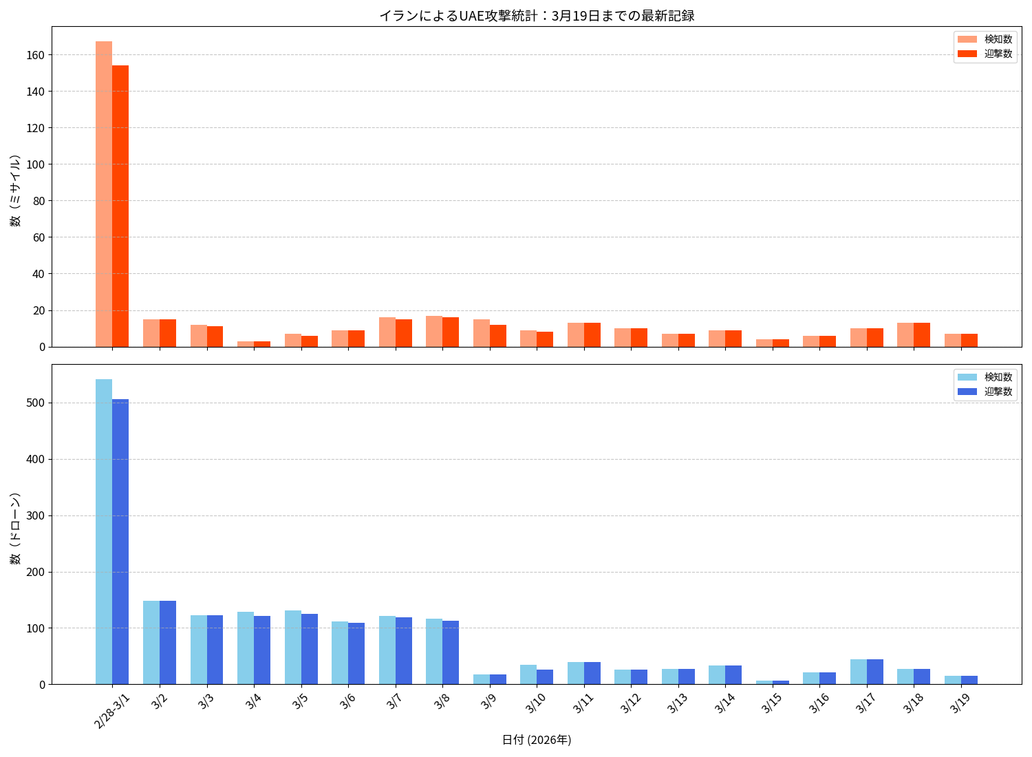 UAEに対するイランからのミサイル・ドローン攻撃、検知・迎撃状況【2026年3月19日まで】