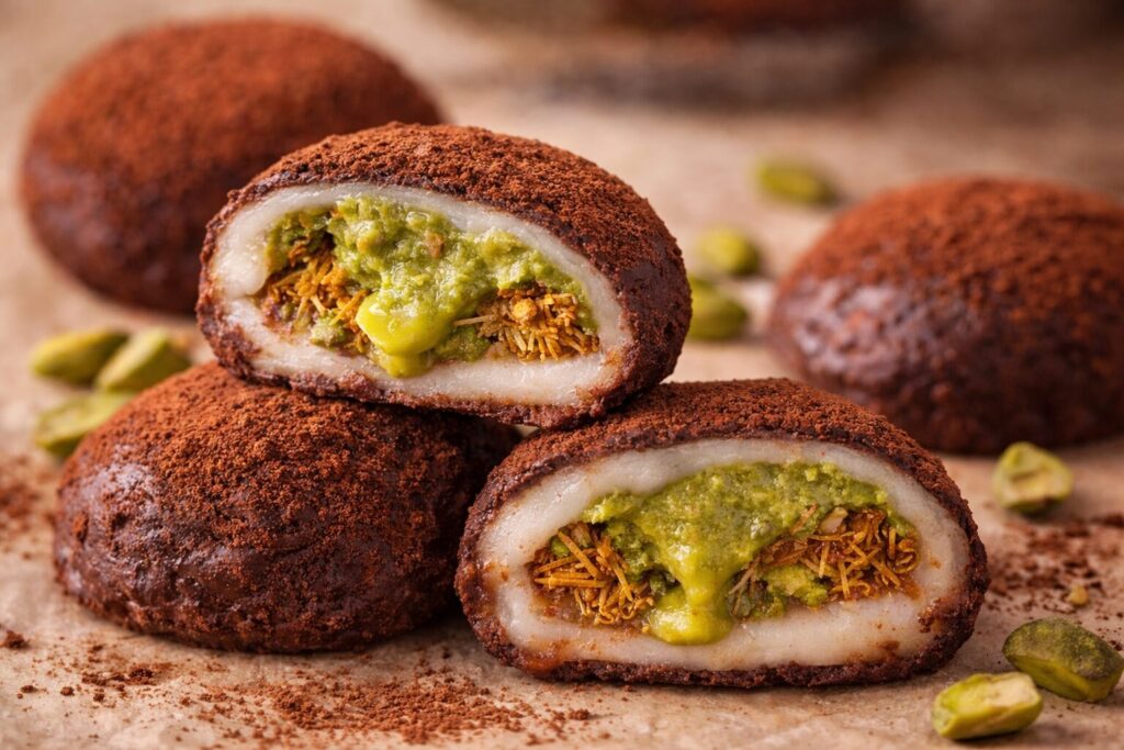 ドバイもちクッキーは、ドバイチョコの特徴であるピスタチオペーストとカダイフ(細い麺状の生地)を、もちもちとしたマシュマロのような生地で包み、仕上げにココアパウダーをまぶした新感覚スイーツです。