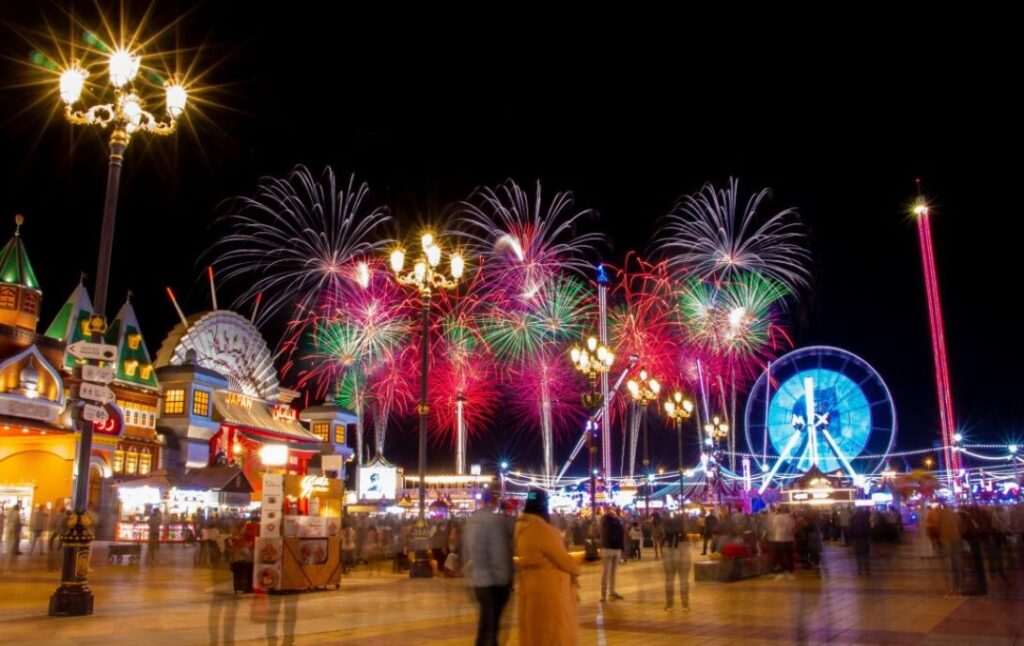 人気観光施設「Global Village」では、毎週金曜・土曜に音楽と連動した花火ショーが開催されます。