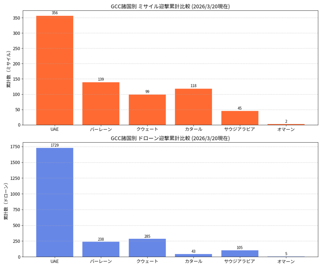 3月20日現在の各国の公式発表および国際戦略研究所(IISS)等の最新報道に基づき、GCC(湾岸協力会議)諸国別の累計迎撃数